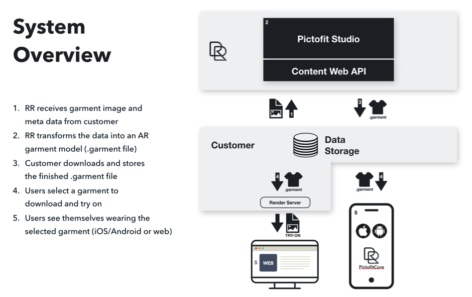 On top of the visual representation, we also provide semantic information about the reconstructed object. This enables you (in combination with one of our SDKs) to provide features like body measurements, size recommendation and mix & match (virtual try-on). Once the system has generated the assets you can access and transfer them to your servers for hosting.