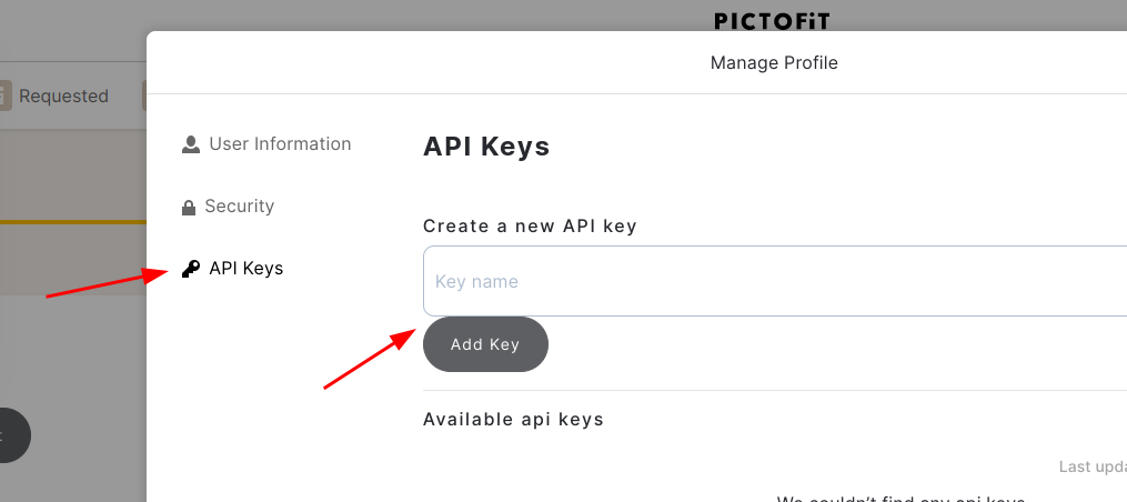 To use our API you can generate API keys. To do that, log in to the PICTOFiT Content Management System (CMS) and open your profile page.