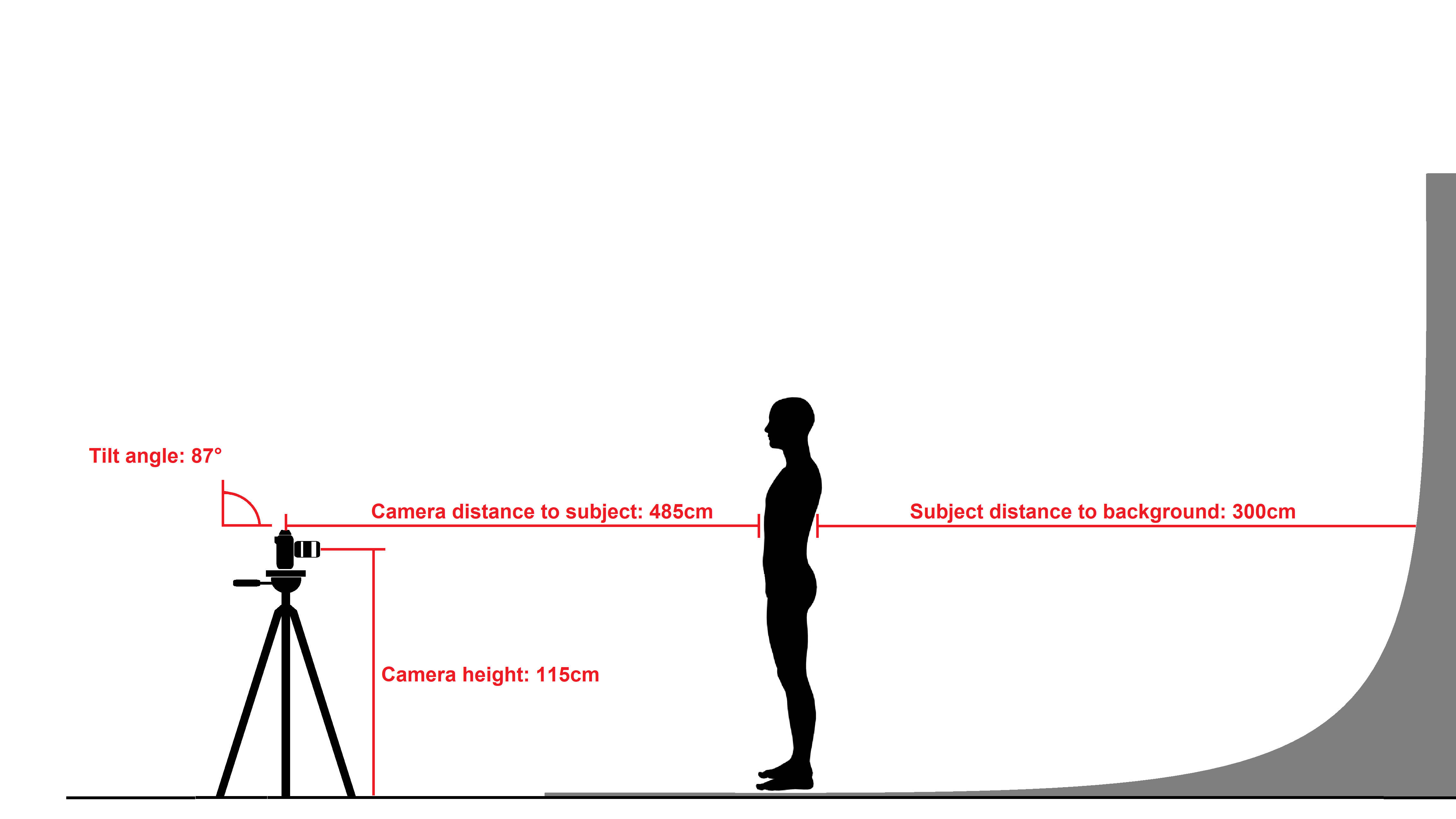 A white seamless backdrop of at least 3 meters high and 2 meters wide should be used for background. The model should stand on the backdrop at a 3 meters distance from the background. Enough backdrop should be allowed at the front of the model to cover the whole camera frame. No gaps, equipment or foreign objects should be seen within the frame. The end results should look like this: