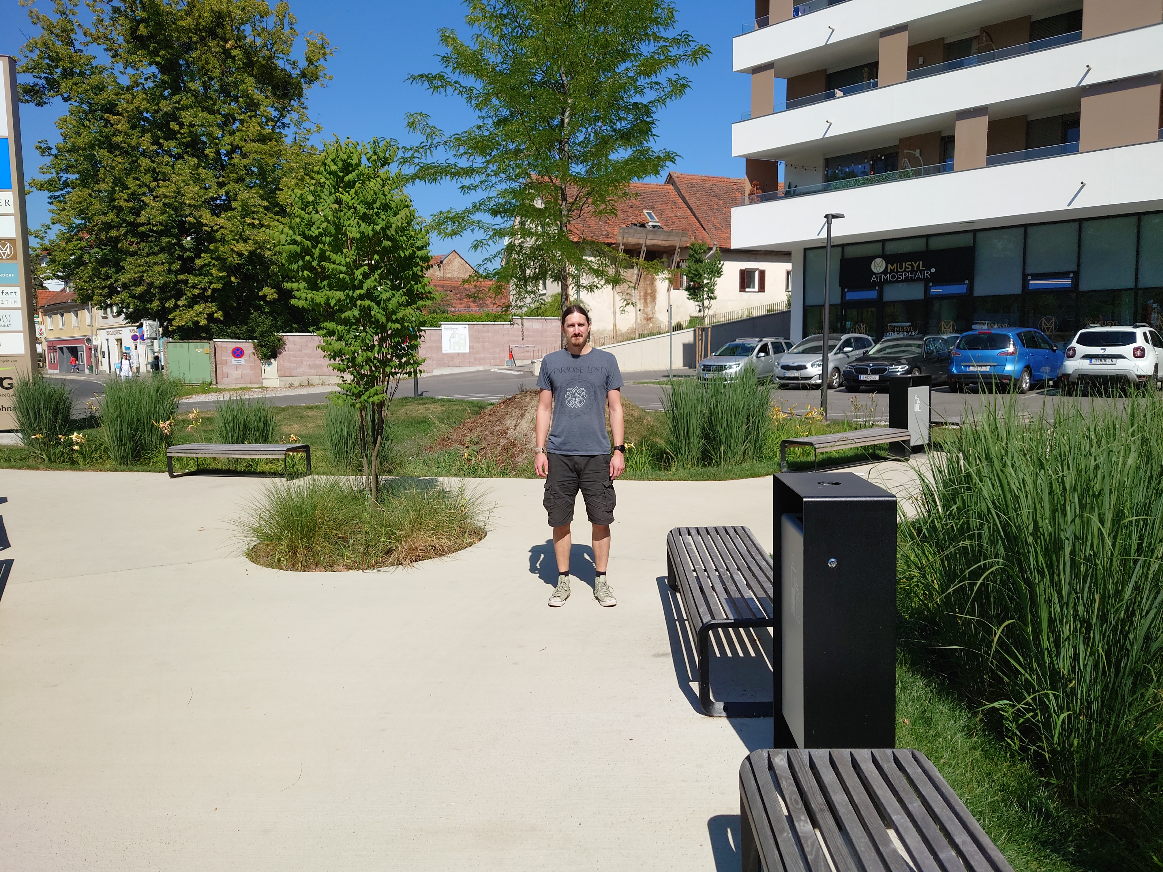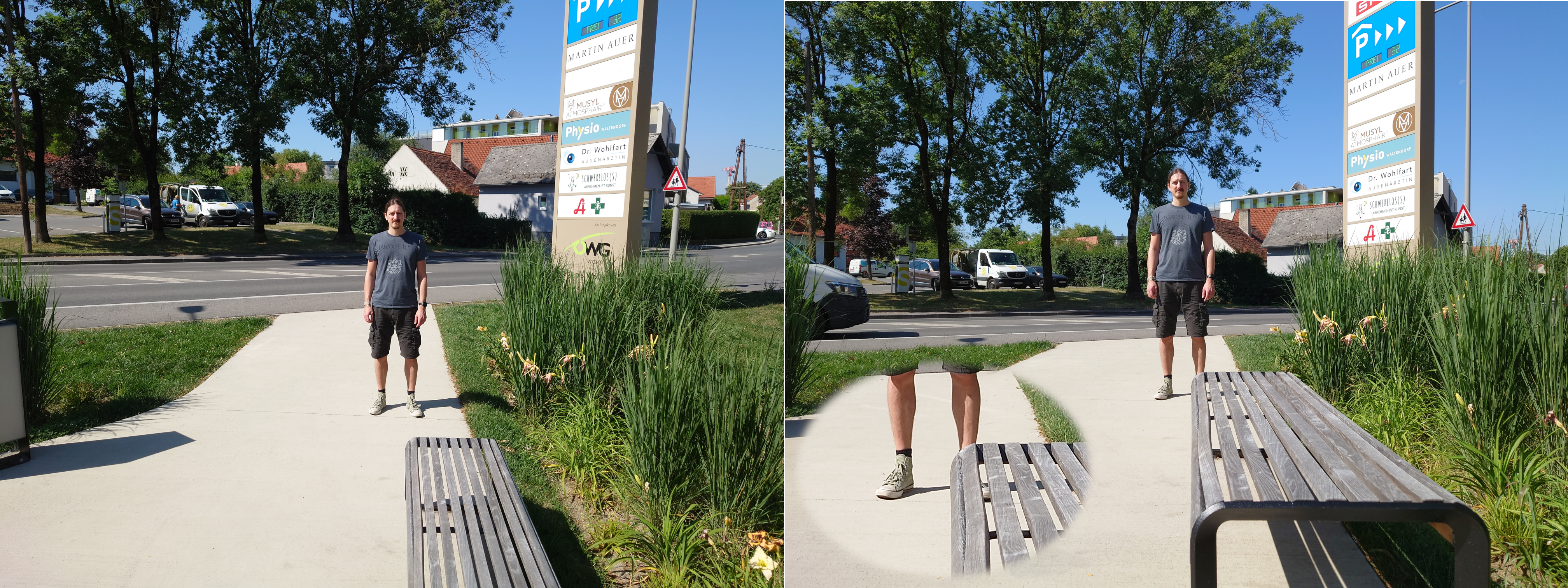 When taking the Input Photo, it may not be immediately obvious that parts of the avatar will be obscured when viewed in a different angle, which is part of the parallax effect. So, it’s important to keep that in mind and check the different angles while taking the picture. In the example below, from the perspective of the Input Photo (left) the foot is not obscured, but when the camera is moved to a lower position (right), which is the case in the finished scene, the left foot is clearly obscured by the bench.