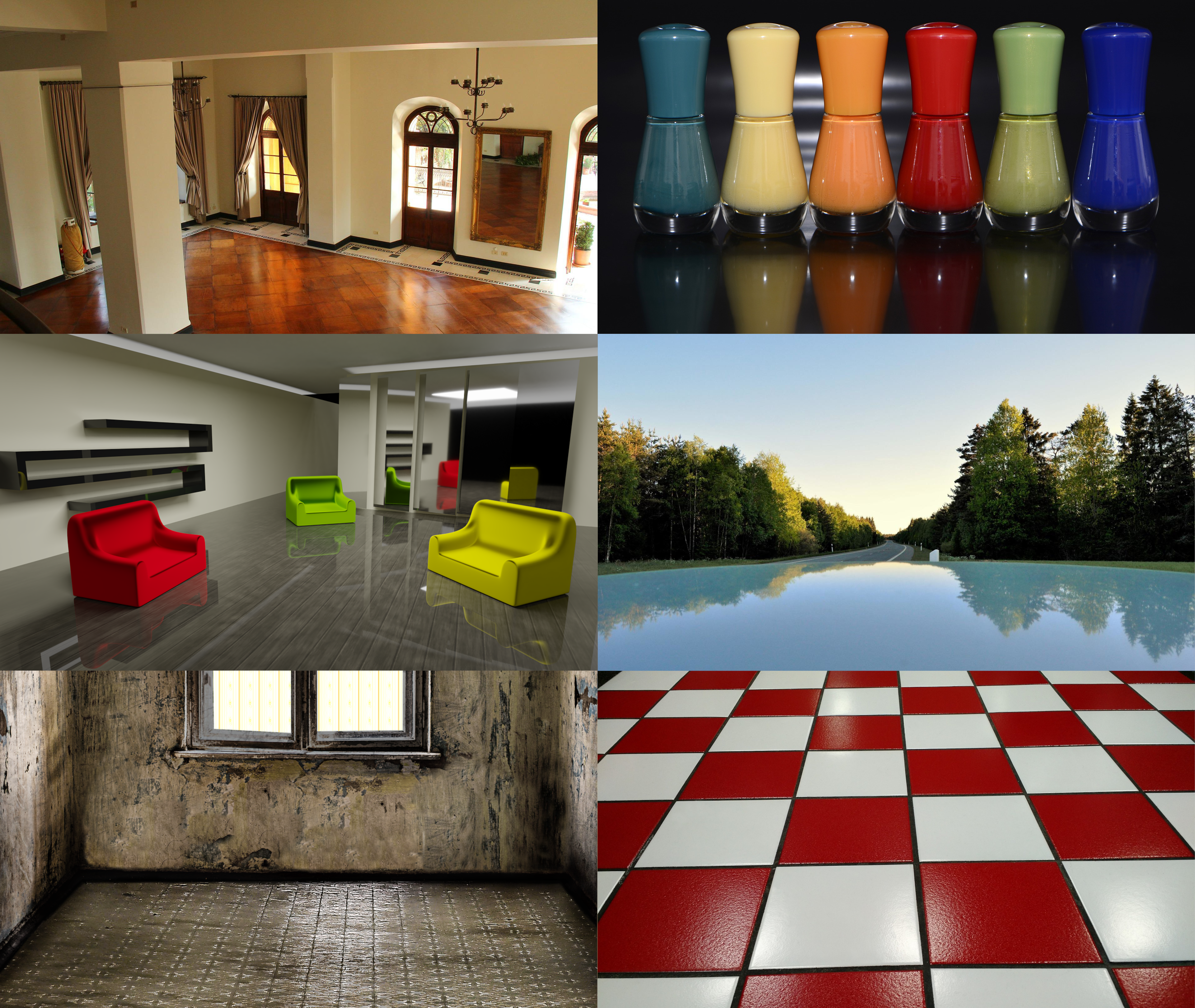 1. Shiny floors. 2. Reflective surfaces. 3. Mirroring surfaces. 4. Water