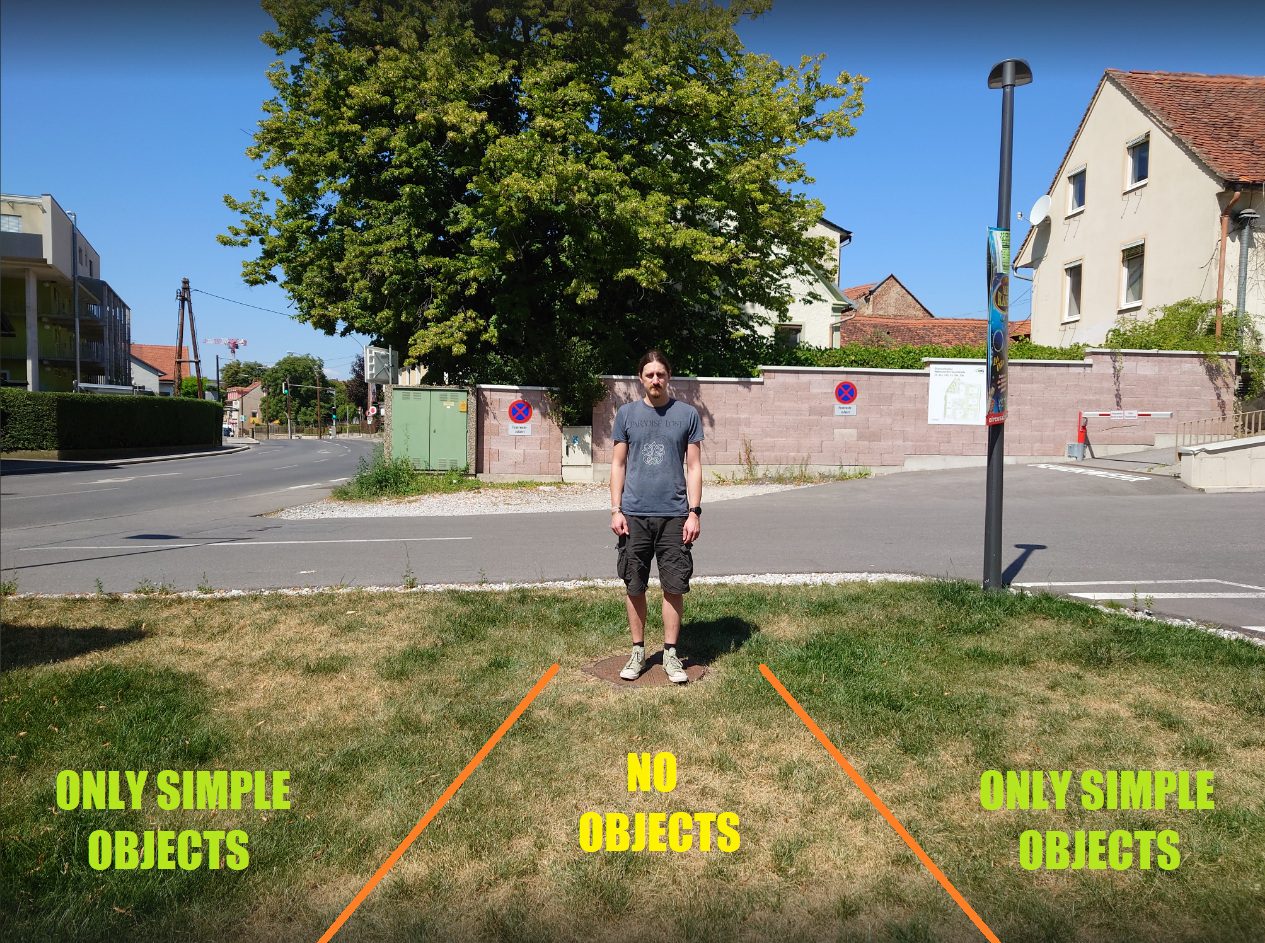 Don’t: Avoid any uphill or downhill directions. The avatar should also not stand in a dent in the ground or on any surface which goes up at the front and covers the avatar's feet. This can be misleading, for example on wavy grounds.