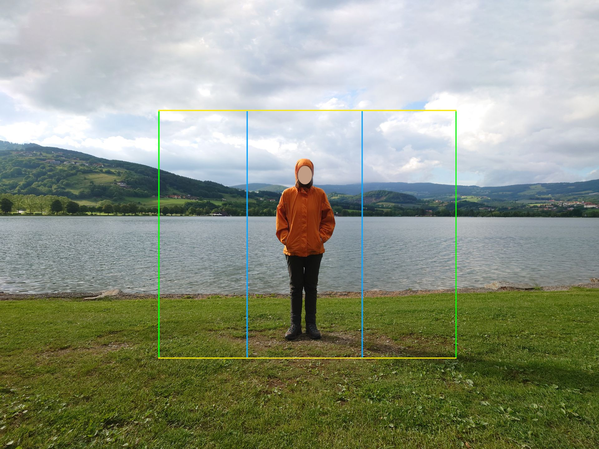 The top and bottom of the frame remains the same, represented above with the yellow line. The green line represents the side crop for desktop, while the blue line is the side crop for a phone.