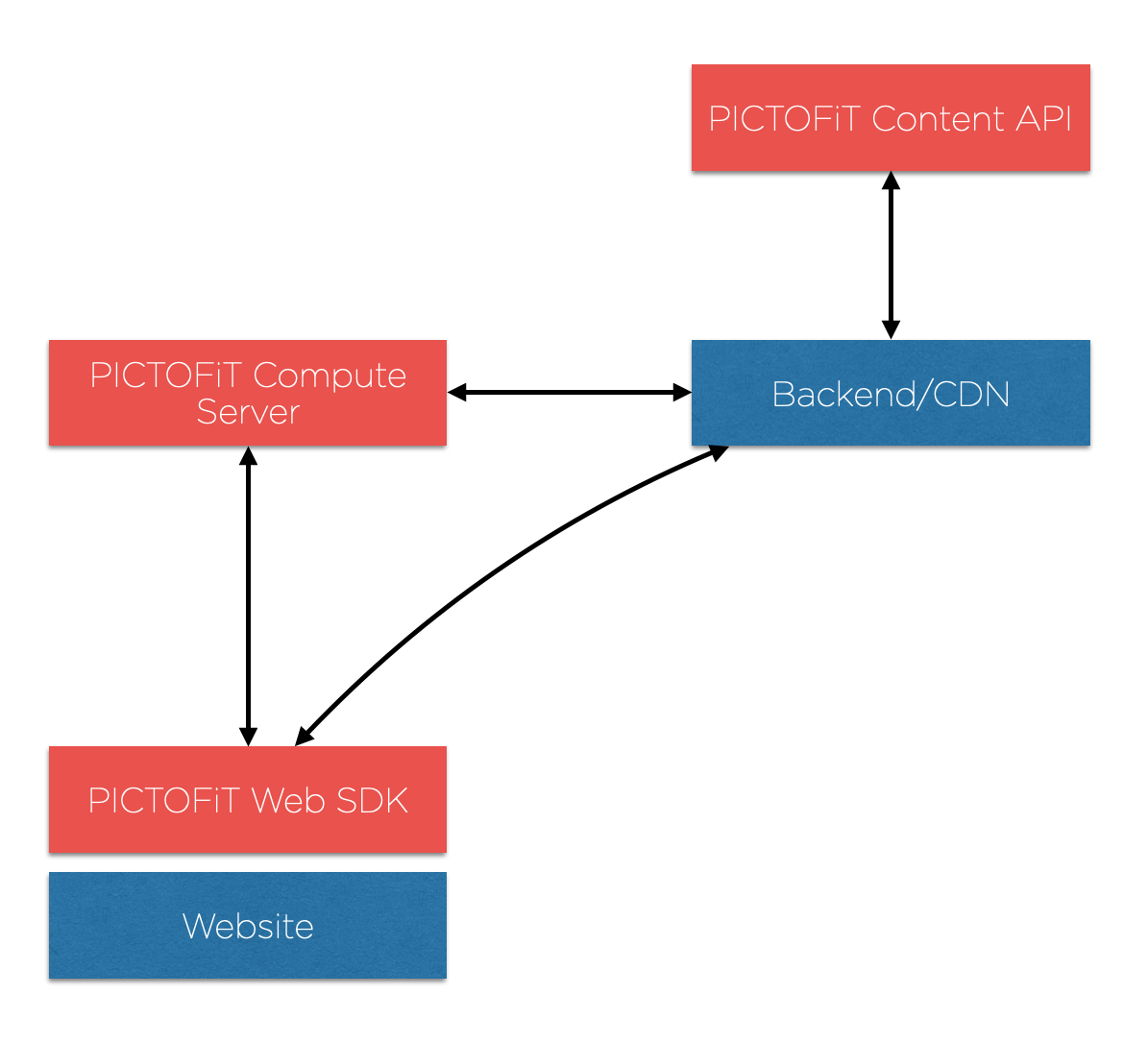 The PICTOFiT Web SDK is responsible for displaying the content and for communicating with the PICTOFiT Compute Server. The library can be included via the Node Package Manager (NPM) or as a standard ES6 module. Central part of this SDK is the Pictofit.WebViewer which displays the content in the browser.