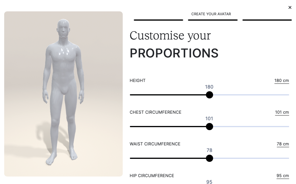 From a few body measurements, we can generate personalised mannequins for mix & match and size recommendation. Based on 6 input measurements, we can recreate the users body shape with an accuracy of around 94%. The resulting full 3D model of the user's body allows to take measurements virtually anywhere on the body. Check out this demo to see the feature in action. You can also find the source code for it in our sample repository.