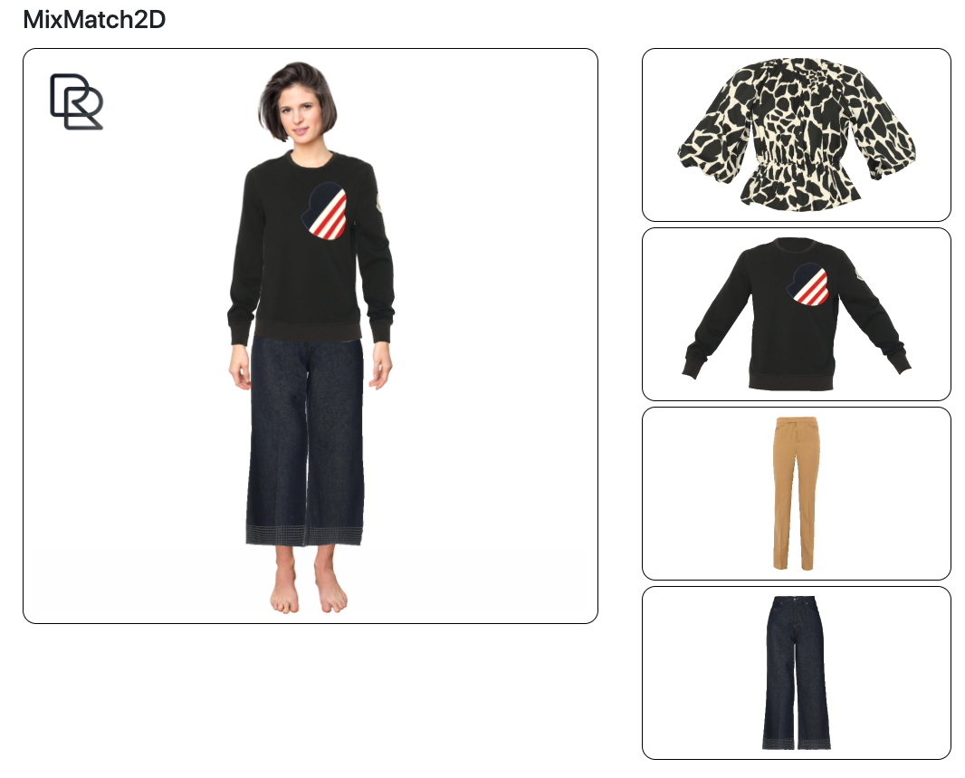 The mix & match feature allows you to virtually create outfits by combining different garments on an avatar. The garments are fitted to the avatars body in a realistic way creating a rendering of the outfit which is often not distinguishable from a photo.